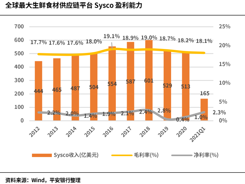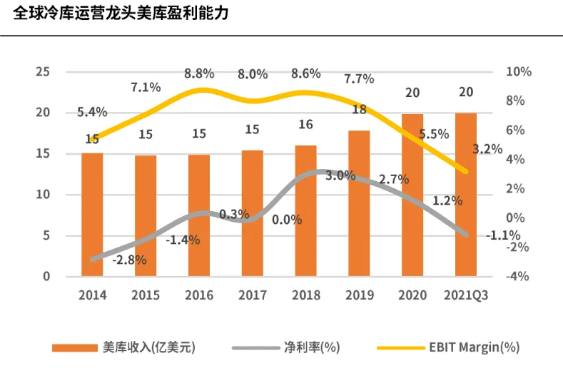 冷链物流业务内容主要包括产品的低温加工、贮存、运输、配送及销售四个环节;冷链运营收费模式包括租金收入、操作费、加工收入等,运营成本包括水电费、搬运费、加工成本、折旧等。冷链服务链条具有复杂性、协调性、信息化、高成本的四大特点,进入门槛较高,盈利能力较弱:参考国际龙头财务状况,全球最大的食品供应链企业Sysco的净利率在2%左右水平,而全球最大的冷库运营商美库净利率在-3%至3%之间浮动。