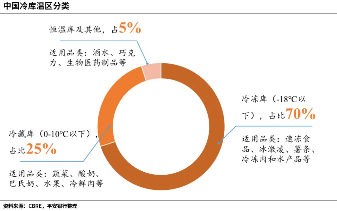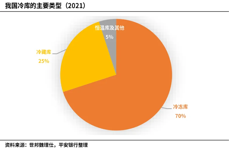 按冷库温区分布主要分为冷冻库(-18℃以下)、冷藏库(0-10℃)、恒温库。冷冻库比占比高达70%,是冷库的主要温区,主要用于存储冷冻食品;冷藏库占比约25%,主要用于存储生鲜及短保物品;部分冷库根据业务需要设计了恒温区和其他温区,用于存放特定物品。