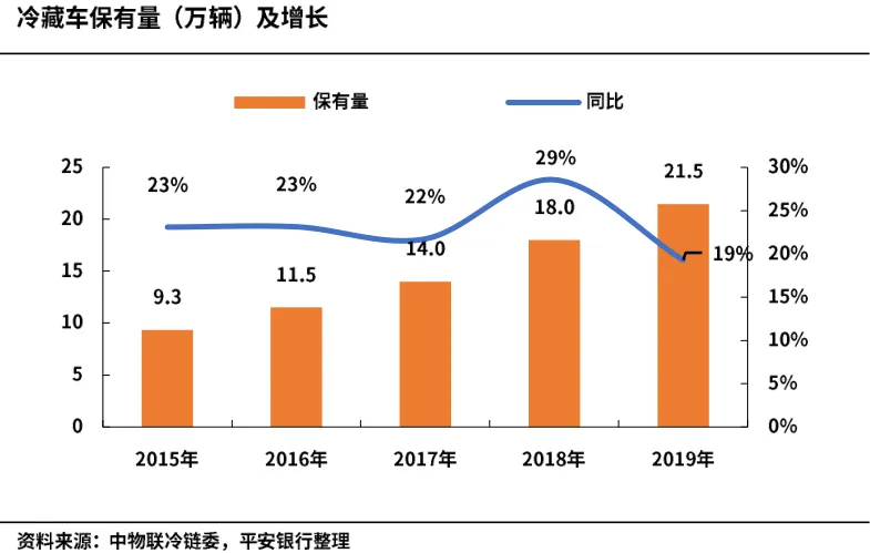 在中央政治局会议提出实施城乡冷链物流基础设施补短板工程要求后,我国冷链基础设施建设加快推进。根据中物联冷链委,2015-2019年我国冷库总量从3740万吨上升至6053万吨,冷藏车保有量从2015年9.34万辆上升至2019年21.47万辆。