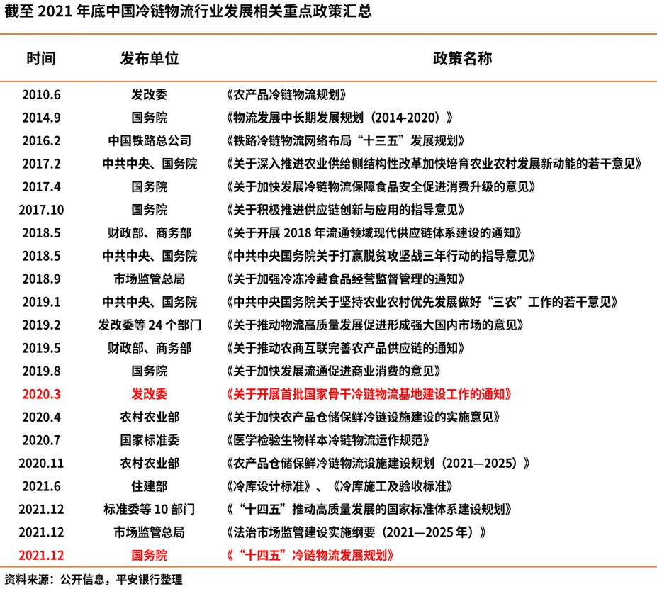 2021年12月12日,国务院办公厅印发《“十四五”冷链物流发展规划》。《规划》是我国冷链物流领域第一份五年规划,规划聚焦“6+1”重点品类,包括肉类、水果、蔬菜、水产品、乳品、速冻食品等主要生鲜食品以及疫苗等医药产品。