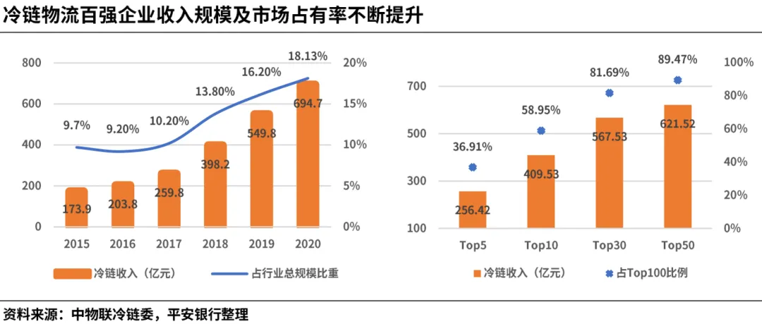 近五年来冷链业务发展迅速,百强企业营收规模不断扩大。2020年百强企业(CR100)冷链业务营业收入合计达694.70亿元,同比增长26.36%,占2020年总市场规模的18.13%;百强企业市场占有率相较于2018年的13.79%、2019年的16.21%逐年增长,冷链市场集中度不断提高。