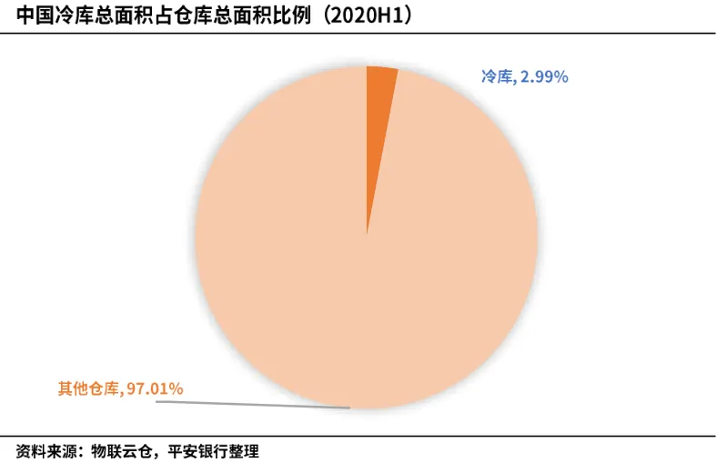根据物联云仓平台冷库数据显示,我国2020年上半年冷库总面积约952.26万平,仅占仓库总量的2.99%。按照我国冷库温区分布来看,冷冻库占比高达70%,是冷库的主要温区,主要用于存储冷冻食品;冷藏库占比约为25%,主要用于存储生鲜及短保物品;部分冷库根据业务需要还设计了恒温库及其他温区,用于存放特定物品。