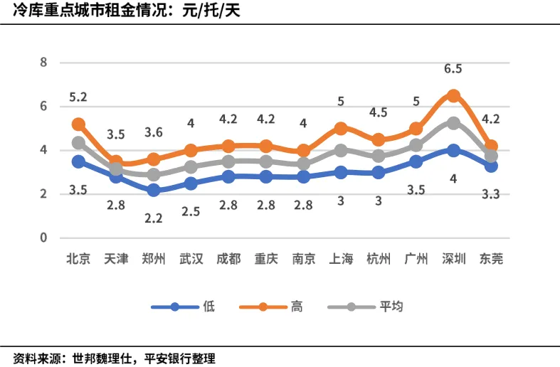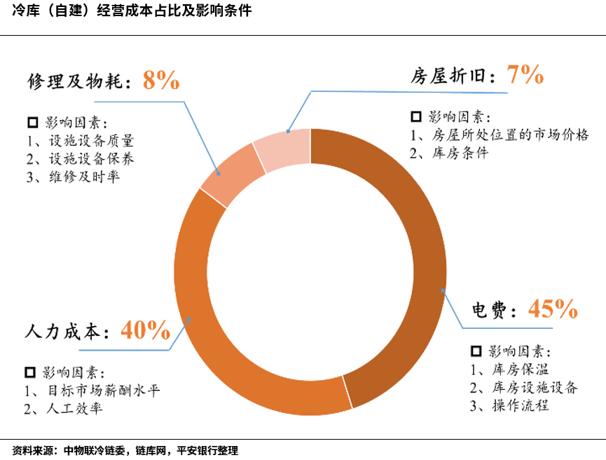 在《冷链物流产业链全景分析——基础设施系列研究之冷链篇》报告中,我们曾对部分国家骨干冷链物流基地和财政部关于冷链专项债的投资额进行了相关梳理,结论是冷库的单位建造投资成本高达5000元/平米。按照自建冷库经营成本折旧和修理费的占比结构,可以推导出冷库的日均运营成本在2.9元/平米/天。