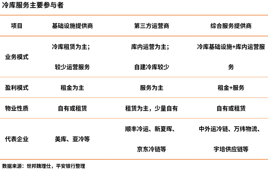 冷库基础设施是冷链业务的底盘,具有位置优势和建造品质优势的冷库将受到市场和客户的青睐;高效稳定的库内运营水平和客户服务能力越来越成为上游企业选择冷链合作伙伴的重要考虑因素。冷库服务主要参与者包括以下三类企业:1)冷库基础设施提供商;2)第三方运营商;3)综合物流服务商。
