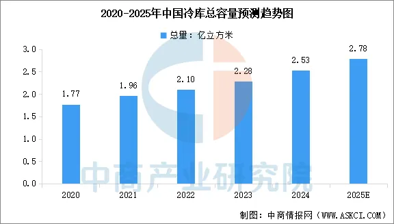 中商产业研究院发布的《2025-2030年中国冷链物流行业深度调研及投资前景预测报告》显示,截至2024年国内冷库总容量达2.53亿立方米,同比增长10.96%。截至2025年前三季度,国内冷库总容量为2.63亿立方米,同比增长7.35%,第三季度新增253.59万立方米,冷库规模持续增长但新增供应有所放缓,中国冷库市场整体呈现供给过剩格局。中商产业研究院分析师预测,2025年全年全国冷库总容量将达到2.78亿立方米。