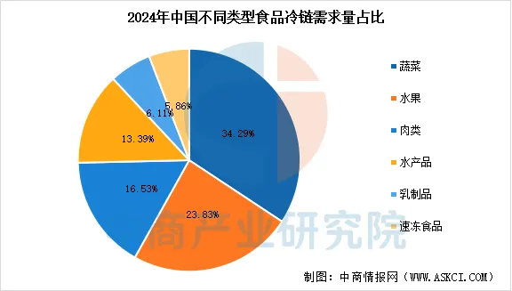 中商产业研究院发布的《2025-2030年中国冷链物流行业深度调研及投资前景预测报告》显示,从不同类型食品冷链需求量占比来看,2024年蔬菜、水果、肉类、水产品、乳制品、速冻食品冷链物流业务需求量分别为1.36亿吨,8910万吨,5605万吨,5083万吨,1600万吨,1702万吨,分别占比34.29%、23.83%、16.53%、13.39%、6.11%、5.86%。