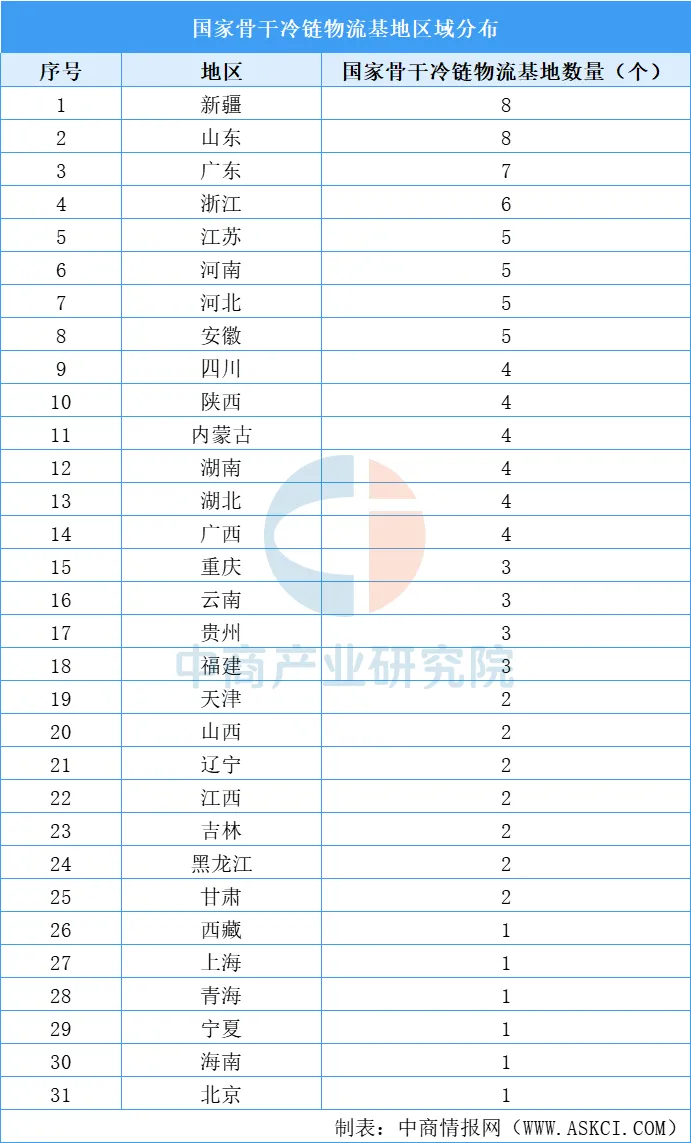 国家骨干冷链物流基地建设是构建现代冷链物流体系的关键举措。截至2025年6月,国家发展改革委已累计发布5批名单,国家级骨干冷链物流基地达到105个,实现了全国31个省(区、市)的全覆盖。其中,新疆、山东国家骨干冷链物流基地均为8个,广东7个,浙江6个,江苏、河南、河北、安徽各5个。