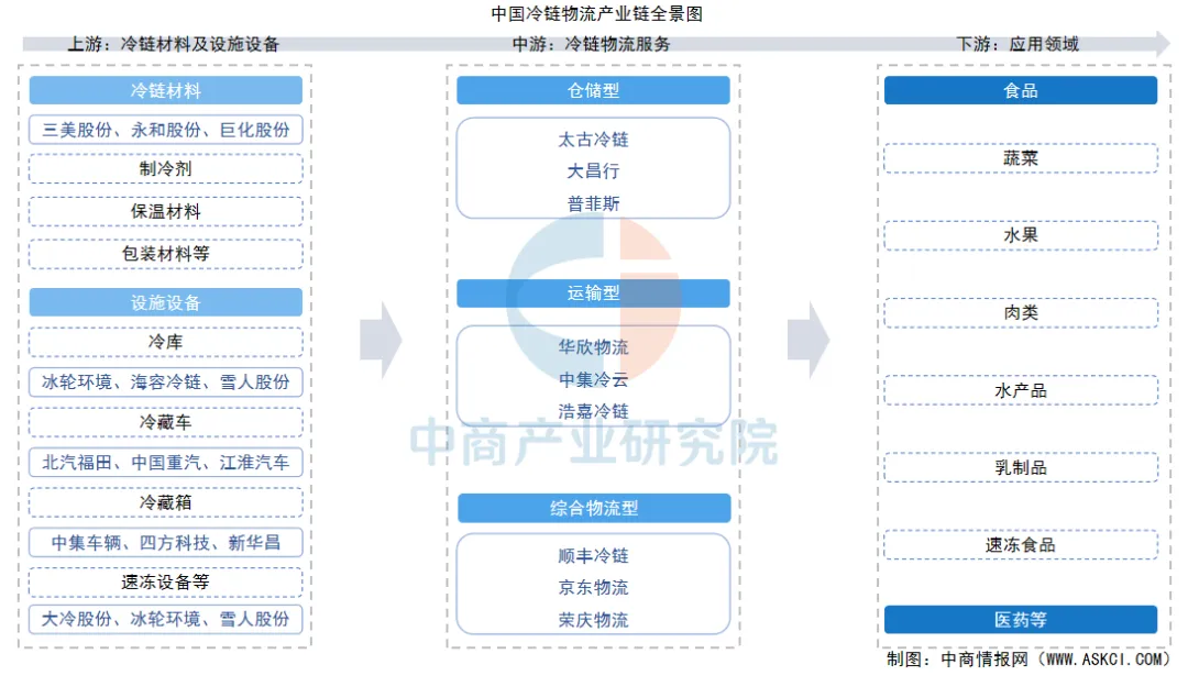 冷链物流产业链分为上游、中游和下游三个主要部分。上游为冷链材料及设施设备供应;中游是冷链物流服务提供者,负责组织仓储、运输、配送等各项运营活动;下游是冷链服务的需求方,主要包括肉类、水果、蔬菜、水产品、乳品、速冻食品等主要生鲜食品以及疫苗等医药产品。
