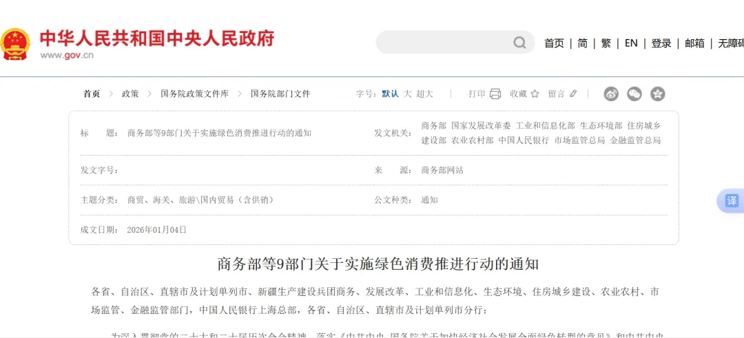 文章来源:《商务部等九部门联合发文推动绿色消费,冷链行业迎低碳升级新机遇》微信公众号: 中物联冷链委2026年1月12日 18:01 北京,原文链接:https://mp.weixin.qq.com/s/ToF7QOsOL0TfsEvd1V06YA